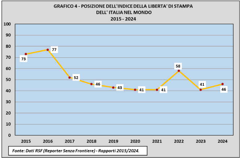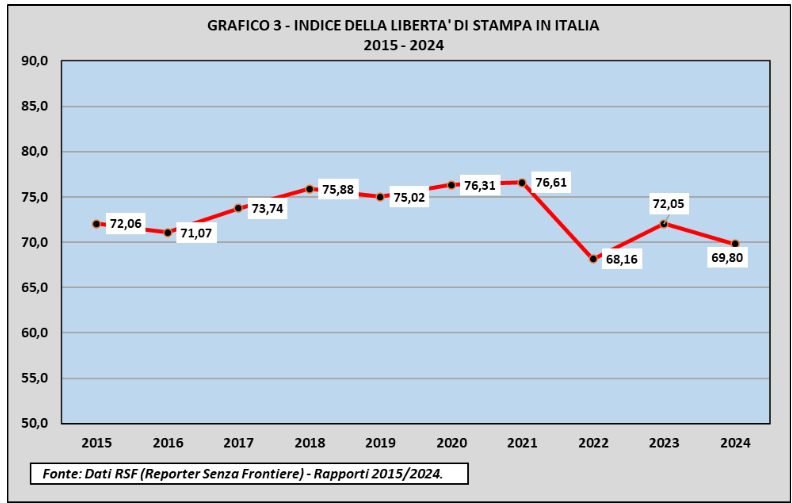 L’Indice della Libertà di stampa (Graf. 3), tra il 2015 e il 2024, dopo l’apice tra il 2018 e il 2021 (tra 75,02 e 76,61), è calato sotto 70.