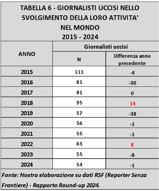 Il mestiere di giornalista può essere anche pericoloso: in 15 anni sono morti oltre 700 giornalisti, con un picco di 111 nel 2015 (Tab. 6).