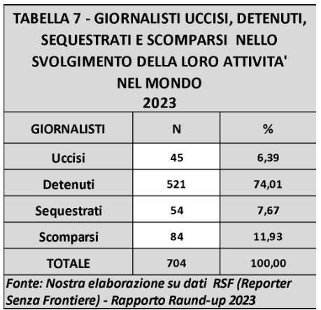 Nel 2023 ai 45 morti, se ne devono sommare 521 in prigione, 54 sequestrati e 84 di cui non si sa più nulla (Tab. 7).