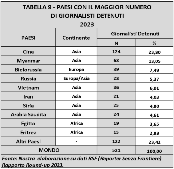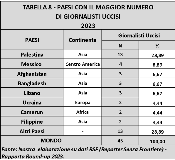 Quelli uccisi (Tab. 8) si concentrano nel Continente meno libertario, l’Asia.