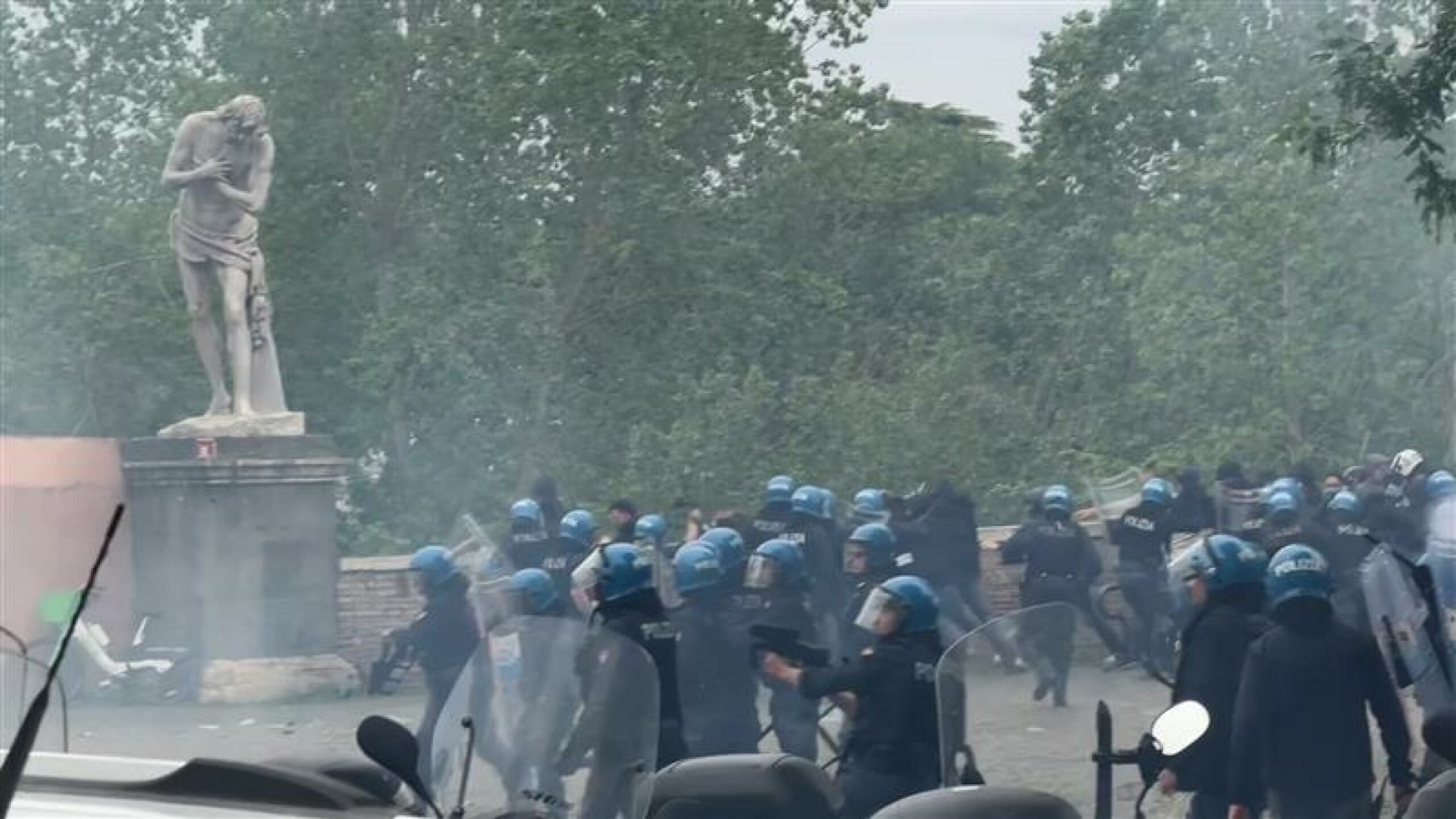 Un fine settimana di “vergognosi attacchi di delinquenti contro le forze dell’ordine“. Tuona così il ministro dell’Interno, Matteo Piantedosi, mentre domenica sera si sta giocando il derby Roma–Lazio: l’antipasto del match di Serie A sono stati gli scontri tra ultras che hanno coinvolto pure gli agenti, 13 dei quali rimasti feriti. Solita violenza del tifo organizzato, che non si riesce a debellare. Ma Piantedosi mette tutto nel calderone: il corteo pro Palestina a Milano di sabato e anche il rave abusivo organizzato a Torino. Eventi con dinamiche completamente diverse, ma nei quali si sono verificati scontri tra frange di manifestanti e agenti.