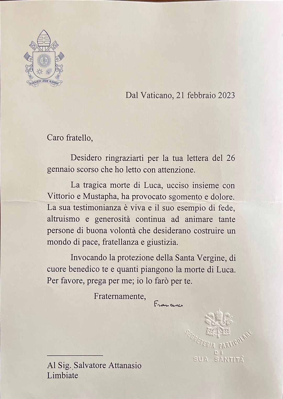 La tragica morte di Luca, ucciso insieme con Vittorio e Mustapha, ha provocato sgomento e dolore. La sua testimonianza è viva e il suo esempio di fede, altruismo e generosità continua ad animare tante persone di buona volontà che desiderano costruire un mondo di pace, fratellanza e giustizia.