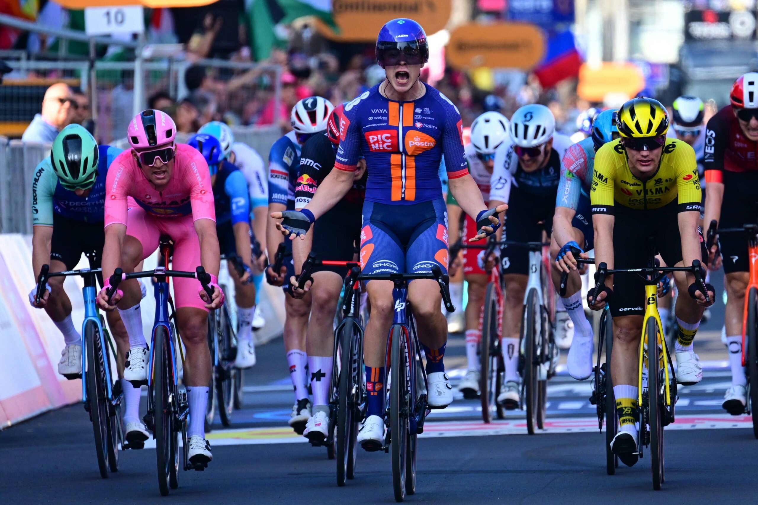 Volata doveva essere, volata è stata. La Alberobello–Lecce, quarta tappa da 189 km con cui il Giro ha fatto il suo rientro in Italia dopo le prime tre frazioni in Albania, era la classica giornata tutta pianeggiante ideale per gli sprinter. La sorpresa però è arrivata proprio sul traguardo: davanti a tutti Casper Van Uden, giovane pistard olandese che a 23 anni coglie il suo più importante successo su strada. A completare il podio dietro il velocista della Picnic PostNL altri due olandesi, Olav Kooij (Team Visma Lease a Bike) e Maikel Zijlaard (Tudor Pro Cygling Team).