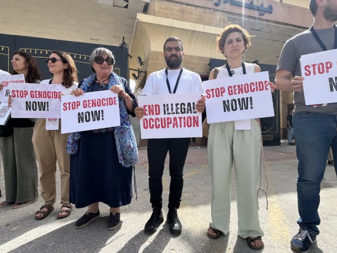 Le autorità israeliane non ci fanno entrare. Come noi, rimangono fuori cibo, acqua, medicinali, Ong, giornalisti, aiuti. Rimane fuori l’umanità. Gaza ha bisogno di noi. Siamo qui per dire che ci sentiamo responsabili ma non vogliamo essere complici dello sterminio del popolo palestinese. Vogliamo impedire che, dopo il genocidio, si compiano anche la pulizia etnica e l’annessione. Ci sediamo per terra e gridiamo tutta la nostra rabbia, che sappiamo essere di tanti e tante altre.