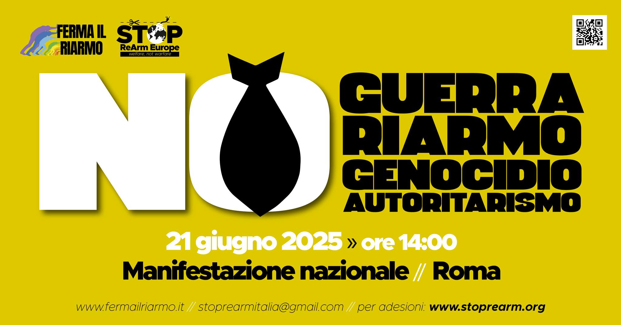 Una grande manifestazione nazionale il 21 giugno a Roma per “fermare Israele, che ha lanciato, rivendicandola pubblicamente, l’offensiva finale su Gaza e il piano di eliminazione e deportazione del popolo palestinese sotto gli occhi di tutto il mondo”. I promotori italiani della Campagna europea “Stop Rearm Europe”, Arci, Ferma il Riarmo (Sbilanciamoci, Rete Italiana Pace e Disarmo, Fondazione Perugia Assisi, Greenpeace Italia), Attac e Transform Italia, hanno lanciato un appello a tutte le reti e organizzazioni per “convergere” nella manifestazione nazionale contro guerra, riarmo, genocidio e autoritarismo.