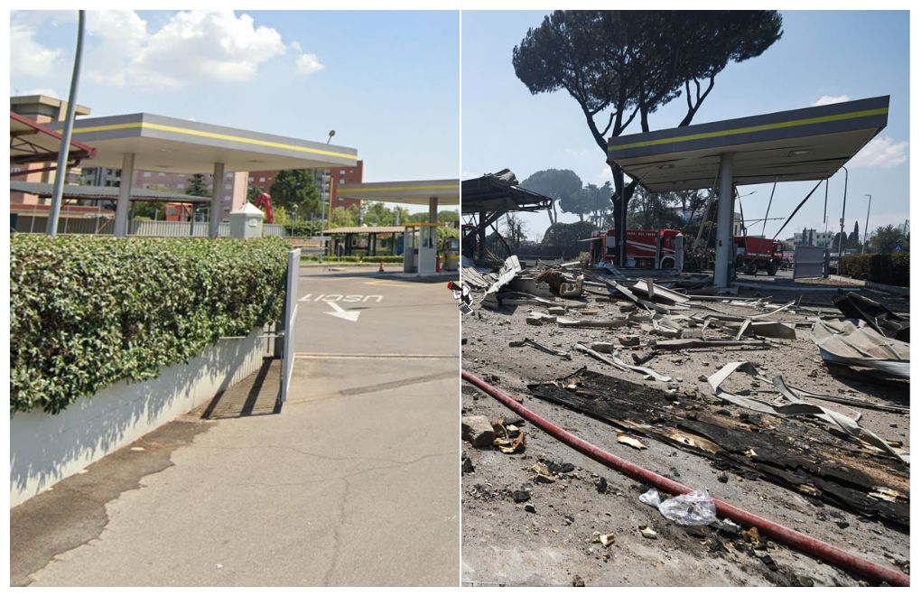 Le immagini da street view e le prime foto scattate sul luogo dell’esplosione a confronto. Scorrendo con il cursore sull’immagine verso destra e sinistra, è possibile notare gli effetti dell’esplosione sull’area comparando lo scatto di oggi e com’era il distributore fino a questa mattina. A sinistra è possibile distinguere la colonnina del Gpl – probabile origine dell’incendio – completamente distrutta.