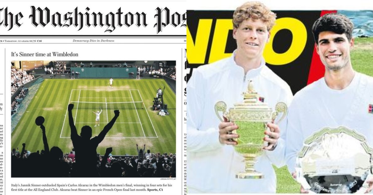 “It’s Sinner time”: la vittoria di Jannik Sinner a Wimbledon, primo italiano a riuscire nell’impresa, fa il giro del mondo e dei media internazionali, tanto da capeggiare sotto la testata del Washington Post. Anche il quotidiano spagnolo Marca dedica un’intera prima pagina allo storico match contro Alcaraz, con una profezia: “Continuerà“. Ne sono convinti più o meno tutti. Gli altri giornali internazionali, come i francesi L’Equipe e Figaro, calcano la mano sulla rivincita di Sinner contro lo spagnolo dopo le due sconfitte in finale a Roma e nel Roland Garros. Ma anche sul fatto che l’altoatesino ha “spodestato” Alcaraz dal trono di Wimbledon.