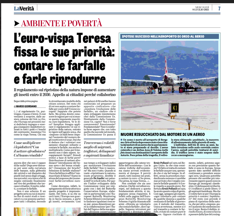 A seguito delle motivazioni dell’articolo 9, l’Italia, con il Pnrr, ha istituito il National Biodiversity Future Center (NBFC), un centro di ricerca dedicato alla biodiversità. Il Centro ha iniziato a censire le farfalle: i pesticidi le stanno decimando, assieme a tutti gli altri impollinatori, facendo venir meno un preziosissimo servizio ecosistemico. Concetti troppo astrusi per Mario Giordano che, su La Verità, in un articolo “spiritoso”, prende in giro gli entomologi, dipingendoli come vispe Terese che con la loro rete rincorrono variopinti insetti, e denuncia l’ultima follia green di Bruxelles: studiare le farfalle. Deride il direttore scientifico del Centro, il prof. Massimo Labra, che, inutilmente, ha provato a spiegare perché le farfalle sono importanti.