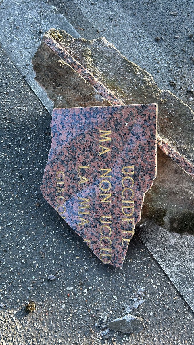 La targa, ormai ridotta in frantumi, riportava la frase: “Uccidete pure me, ma l’idea che è in me non l’ucciderete mai”. È una parte del famoso discorso pronunciato da Matteotti alla Camera il 30 maggio 1924, quando denunciò i brogli elettorali del Partito fascista alle elezioni. Rapito il 21 luglio del 1924, il cadavere di Matteotti venne ritrovato il 16 agosto nella foresta della Quartarella, fuori Roma. La lapide era stata stata posta nel 1974, in occasione del cinquantennale del delitto. Nel corso degli anni, accanto sono state aggiunte altre tre targhe commemorative nei pressi del monumento dedicato al deptato socialista. Nel 2017 la lapide era stata completamente distrutta, mentre nel 2024 era stata oggetto di atti vandalici, proprio nella giornata in cui era apparso un cartello con su scritto “Area sottoposta a videosorveglianza” con tanto di telecamera stampata sopra.