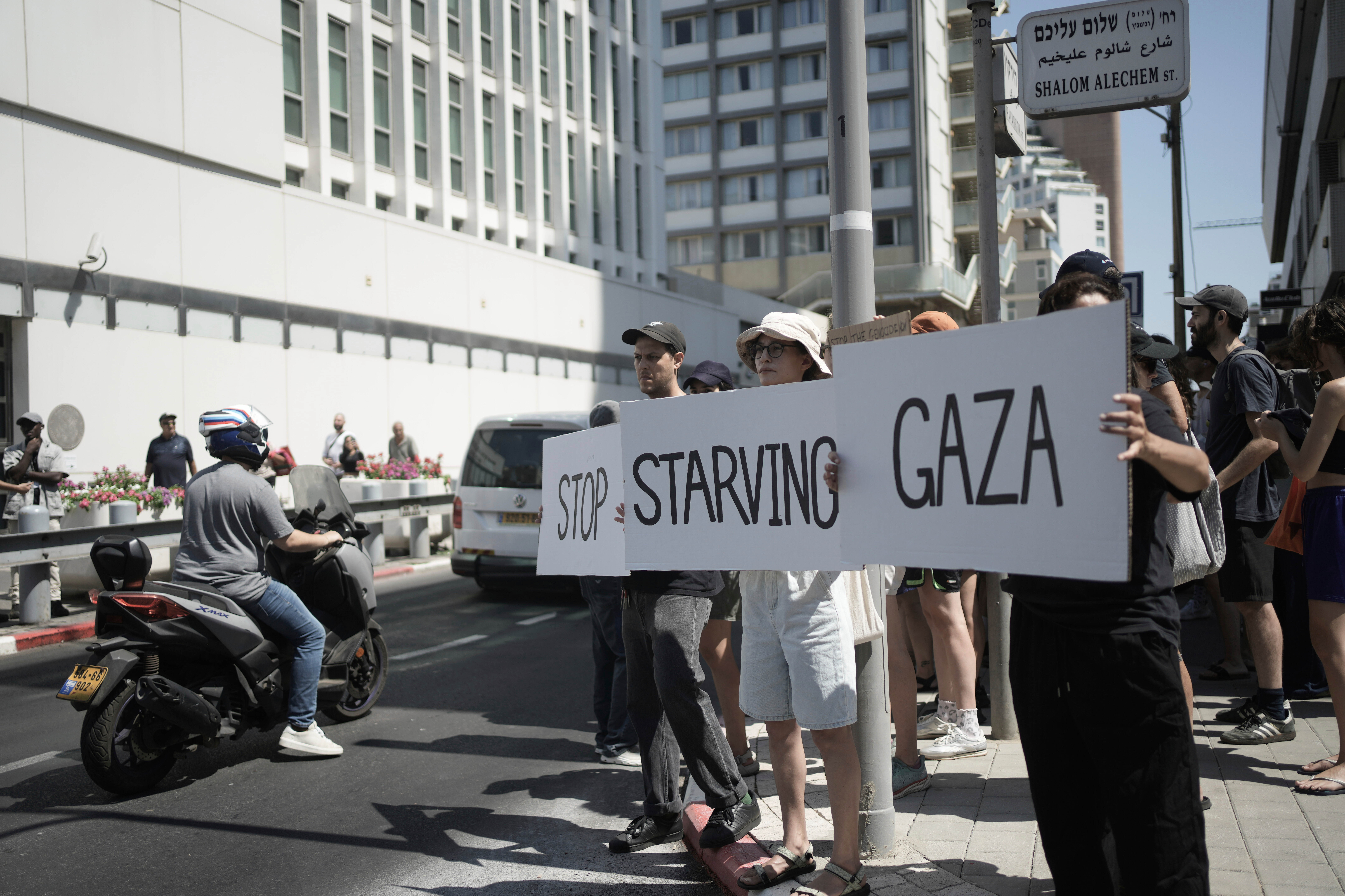 Nella foto in alto | Attivisti israeliani protestano con cartelli e pentole contro la fame dei civili palestinesi nella Striscia di Gaza fuori dall’ambasciata americana a Tel Aviv