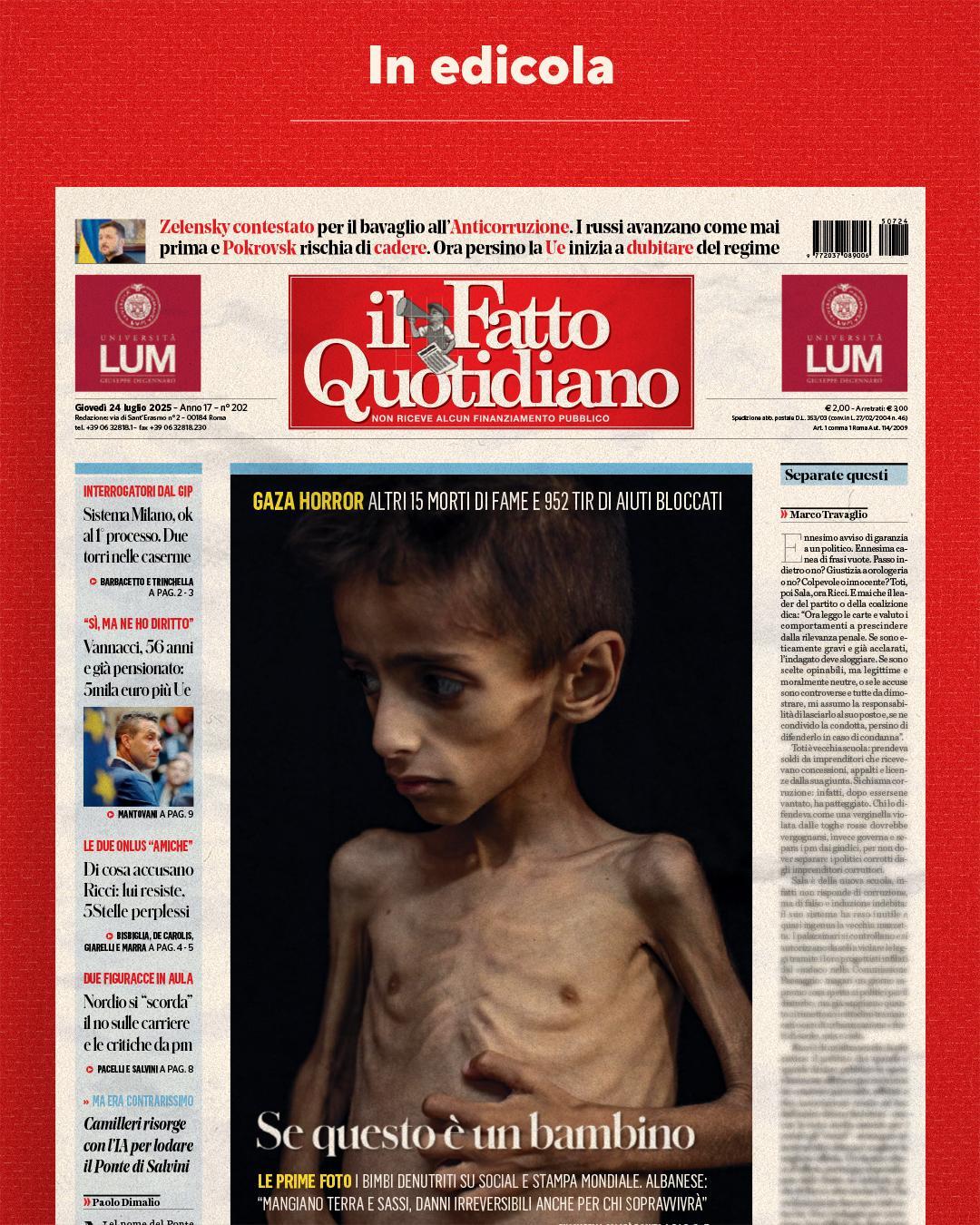 La foto «da Pulizer» de Il Fatto Quotidiano dal titolo parafrasato di Primo Levi “Se questo è un bambino”, del 24 luglio 2025, è un atto di accusa a tutto il mondo, a tutta la cosiddetta inutile politica e a tutte le chiacchiere ovunque e da chiunque. Quando una casa brucia, non ci si ferma a commentare come si muove il fuoco, ma si prova a spegnerlo subito, prima che dilaghi intorno e bruci tutto. La foto e il titolo mostrano la realtà di adesso e il nome dell’ebreo Primo Levi, scrittore, chimico e partigiano contro il nazifascismo.