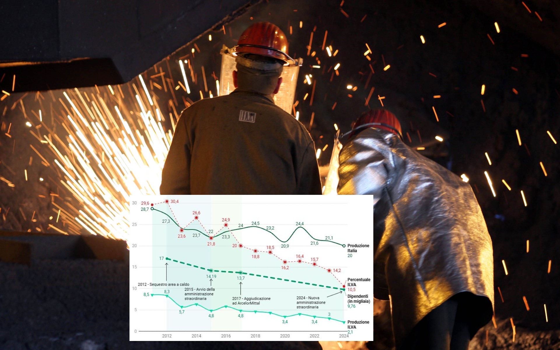 L'acciaio sfornato si è ridotto a un quarto e si sono persi oltre 7mila posti di lavoro: i dati, impietosi, raccontano come l'Ilva sia ormai sempre più marginale