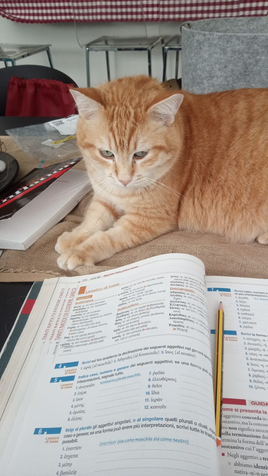 Nelle ultime settimane le cronache dalla Striscia ti facevano così incazzare che – ex pallanuotista prestato alle vasche in piscina e appassionato di surf, del tutto disinteressato alla serie A – in pausa pranzo preferivi leggere le novità dal calciomercato. Poi tornavi alla scrivania e una nuova foto, una nuova testimonianza sul genocidio ti riaccendevano la rabbia. Per chi fa la nostra vita l’assuefazione alla strage quotidiana, alla quotidiana conta dei morti, è un rischio dietro l’angolo. Tu, che le altre notizie dell’ultim’ora tendevi a sminuirle con un “vabbè”, a quello non avevi la minima intenzione di abituarti. L’avevi scritto, parlando d’altro, nel tuo ultimo libro, non a caso un Piccolo manuale per grandi rivoluzioni: “Il futuro appare per tutti sempre più precario, incerto. Se non si parla più di lotta e di conflitto, lotta e conflitto spariscono. Ma lotta e conflitto ci sono, bisogna schierarsi, far credere che non ci siano servi a chi domina. Il vero e ultimo presidio a tutela di diritti e tempi di vita siamo noi. Tutto quello che appartiene alle persone che lavorano è stato conquistato con impegno, determinazione, sacrifici e solidarietà. Mai alcuna gentile concessione”. El pueblo unido…, come ci ricordava ogni giorno la suoneria del tuo cellulare. Buona onda. (Nella foto sotto, il gatto di Mauro che lo assiste nello studio della grammatica greca)