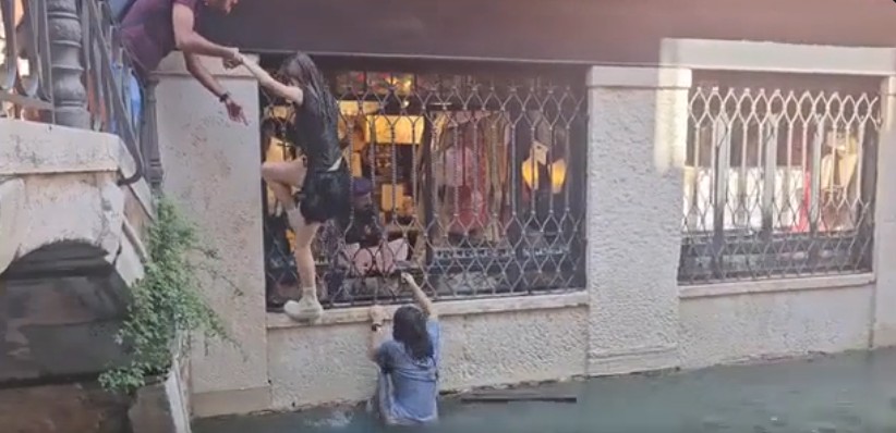 Fortunatamente l’episodio si è verificato in un canale interno della città lagunare, senza rischi per le persone finite in acqua. I malcapitati hanno dovuto aggrapparsi alle barche ormeggiate o alle grate di alcune finestre dei palazzi a pelo d’acqua per tornare a riva. Il video, ovviamente, è spopolato sui social in pochissimo tempo il giro dei social in breve tempo.