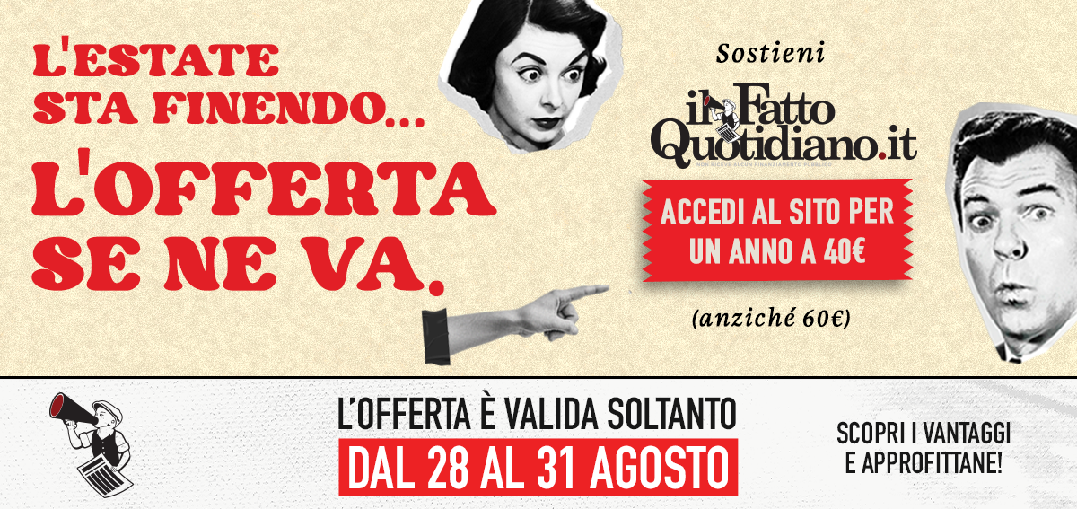 Ogni inchiesta, ogni approfondimento, ogni parola pubblicata nasce con un solo obiettivo: raccontare i fatti, anche quando sono scomodi, anche quando fanno rumore. Si tratta di una sfida quotidiana che possiamo affrontare grazie a voi. Per questo motivo, abbiamo pensato alla possibilità di sottoscrivere un abbonamento a ilfattoquotidiano.it a un prezzo agevolato: un anno a soli 40€ invece di 60€. Un piccolo prezzo, per un grande gesto che fa davvero la differenza.