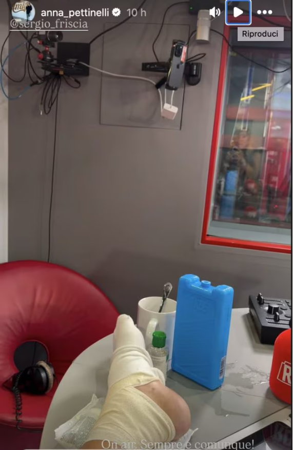 Nonostante il piccolo infortunio, la conduttrice non ha voluto rinunciare all’appuntamento con gli ascoltatori di RDS. Accanto a Sergio Friscia, suo partner radiofonico, si è presentata in studio pronta a condurre il programma, come sempre. Il collega, riprendendo la scena con il telefono, ha mostrato la postazione ordinata e poi ha girato la telecamera verso di sé e Anna, immortalando la fasciatura con la scritta: “On air sempre e comunque”.