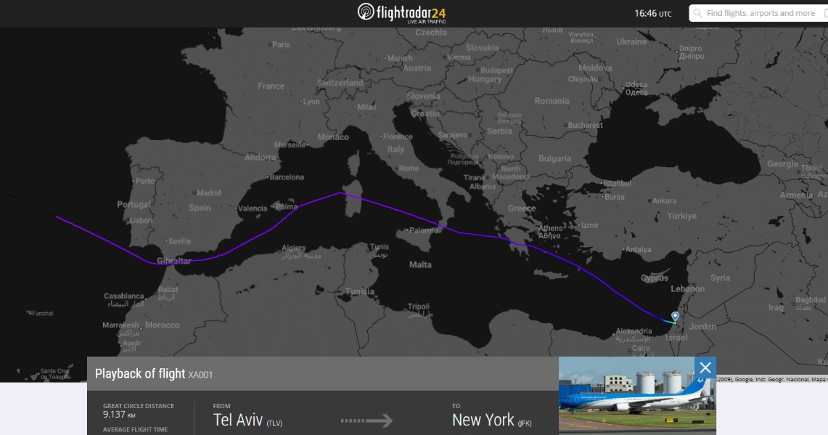 Come si nota seguendo i tracciati della piattaforma Flightradar24, l’aereo di Netanyahu decolla da Tel Aviv e percorre la solita rotta. Sorvola il Mediterraneo, poi la Grecia e l’Italia passando sopra la Calabria e la Sardegna. A quel punto la virata: evita la Francia, la Spagna e le sue isole. Addirittura attraversa “via mare” lo Stretto di Gibilterra, con una rotta che sembra più che altro quella di una nave.