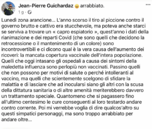 Ricordo che vaccinarsi non era obbligatorio (mentre pagare le tasse lo è) e che chi non era vaccinato era tanto capace di trasmettere il virus quanto chi non lo fosse (il Regno Unito isolava allo stesso modo, all’arrivo dall’estero, vaccinati e non vaccinati proprio per questo motivo). Tuttavia, la comunicazione mediatica e politica ha spesso trasformato questa realtà sanitaria in un giudizio morale: il non vaccinato (e non chi era responsabile del taglio del numero di posti in terapia intensiva negli ultimi venti anni) non era più soltanto una persona a rischio, ma diventava “colpevole” delle sofferenze collettive.