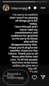 Dopo aver rassicurato i propri fan scrivendo “sto bene”, nella storia Instagram successiva, la Young ha annunciato di dover cancellare il suo show a Washington DC dello stesso giorno: “Mi dispiace confermare che non suonerò a DC oggi. Amo questo lavoro e non do mai per scontato il mio pubblico, quindi mi dispiace per chi sarà deluso dalla mia assenza. Spero che riuscirete a darmi un’altra opportunità in futuro – la cantante ha poi concluso – Grazie a chi ascolta e ci tiene. Per tutti quelli a cui piace insultare, per favore lasciatemi stare almeno per un giorno.”