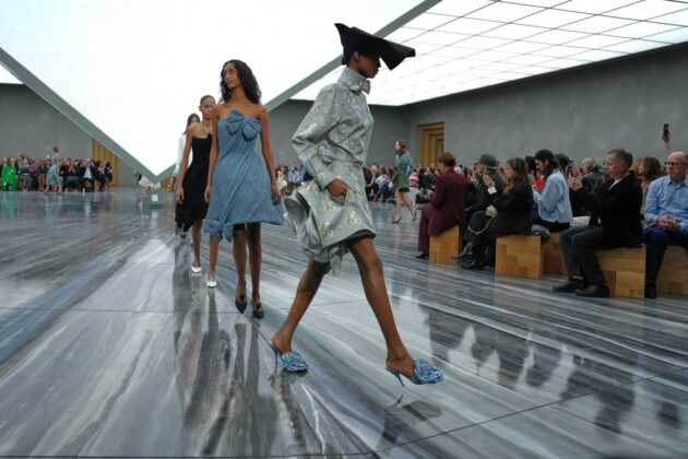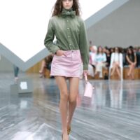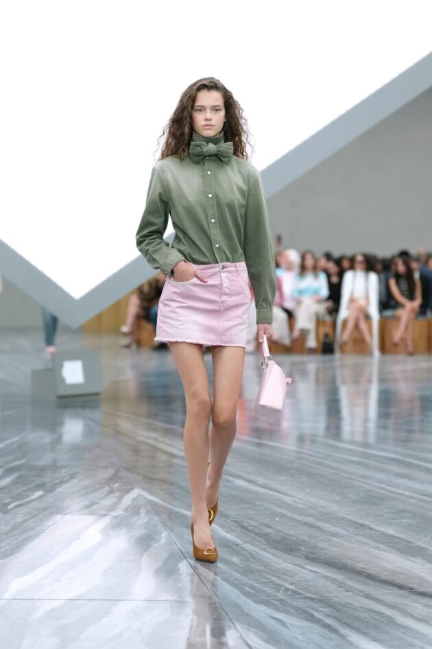 Sostanziosa, articolata, e già virale. La collezione si è sviluppata su una formula precisa e geniale: un pezzo importante ispirato al passato, accostato a un capo moderno, quasi basico. Così, abiti dalle rigide strutture panièr settecentesche sfilano con top essenziali. Giacche d’ispirazione antica si portano con semplici minigonne di jeans dall’orlo sfrangiato, in un cortocircuito temporale audace e riuscitissimo. E cappelli tricorno da D’Artagnan completano il tutto con un tocco di irriverenza. Ma è nelle sue celebri “storpiature” che emerge il tocco inconfondibile di Anderson. I revers di una giacca si allungano a dismisura fino a diventare fiocchi giganti; le code di uno smoking si invertono, apparendo sul davanti; un cappotto si allaccia al contrario. Sono piccoli, geniali divertissement che sovvertono le regole della sartoria, e che convivono con la delicatezza di ricami di micro fiori dall’effetto impressionista, nuove borse rettangolari in camoscio con loghi invisibili e décolleté da educanda a cui spuntano due piccole orecchie da coniglio. E mentre la sfilata si chiude, sui social già impazzano i capi-simbolo: gli abiti scultorei e, soprattutto, le gonne con quel grande, irresistibile fiocco sul fianco che tra qualche mese vedremo ovunque.