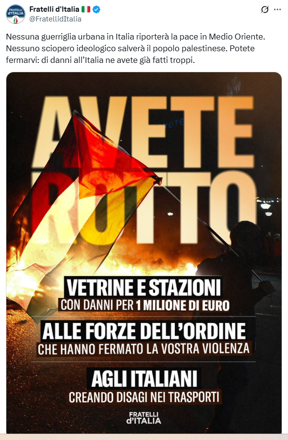 “Avete rotto. Vetrine e stazioni con danni per un milione di euro. Avete rotto alle forze dell’ordine che hanno fermato la vostra violenza. Avete rotto agli italiani creando disagi nei trasporti”. Fratelli d’Italia con una card su X attacca le piazze pro-Gaza e lo sciopero generale indetto da Cgil e Usb. “Nessuna guerriglia urbana in Italia riporterà la pace in Medio Oriente. Nessuno sciopero ideologico salverà il popolo palestinese. Potete fermarvi: di danni all’Italia ne avete già fatti troppi”, si legge nel post. Ma la risposta degli utenti social non è stata quella immaginata dal partito di Giorgia Meloni.