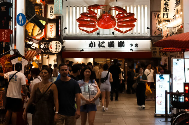 Una miriade di luci al neon illuminano la notte della terza città più grande del Giappone. Brillano in stile Blade Runner, dandole un’energia vibrante che la pervade togliendole il sonno: un Genius loci bizzarro sembra accogliervi in una grande festa, soprattutto nel quartiere di Dotonbori, il cuore pulsante di Osaka, simile ad un luna park. Ci sono più luci che a Natale in questo incrocio di strade affollatissime ad ogni ora del giorno e della notte, dove affacciano insegne luminose, qualche drago, polpo o granchio gigante, mascotte di ristoranti che, strano ma vero, sono diventate delle autentiche icone come il Kani Doraku Honten, l’enorme crostaceo animato affisso sopra l’entrata del locale, esempio di marketing ben riuscito, sorvolando lo stile un po’ kitsch.