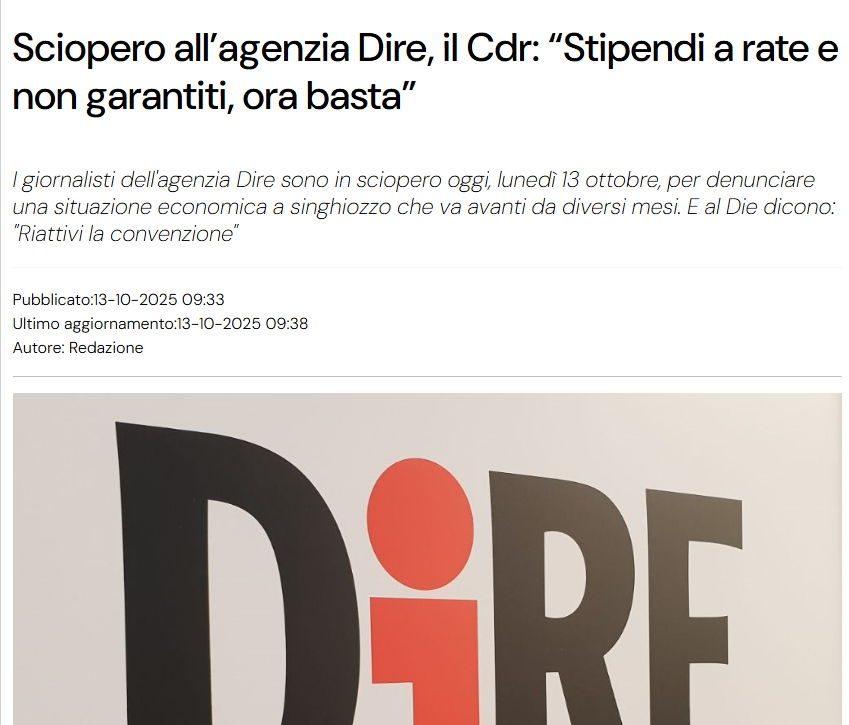 L’assemblea dei redattori e il comitato di redazione (cioè la rappresentanza sindacale) dell’agenzia Dire hanno proclamato una nuova giornata di sciopero per oggi, lunedì 13 ottobre, dopo quelle dei mesi scorsi. I giornalisti dell’agenzia di stampa incrociano le braccia per denunciare “l’insostenibile condizione economica di lavoratrici e lavoratori, tra stipendi a singhiozzo o percepiti a rate, e per avere risposte concrete e rapide dalla proprietà e dalle istituzioni”.