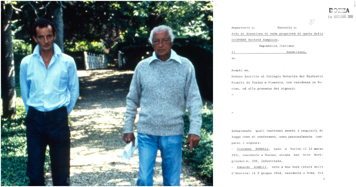 Il documento, un dattiloscritto di quattro pagine, riporta in alto a destra del suo frontespizio due timbri: “BOZZA” e “14 novembre 2000”. Esattamente 24 ore prima di una tragedia che avrebbe sconvolto la famiglia Agnelli. Nelle ultime righe della seconda pagina, esplicitando l’intestazione della bozza (“Atto di donazione di nuda proprietà”), si legge che “il signor Giovanni Agnelli dona al signor Edoardo Agnelli, che accetta, la nuda proprietà. Riservandosi l’usufrutto generale vitalizio di una quota di lire 5 miliardi della DICEMBRE Società semplice, con sede in Torino…”.