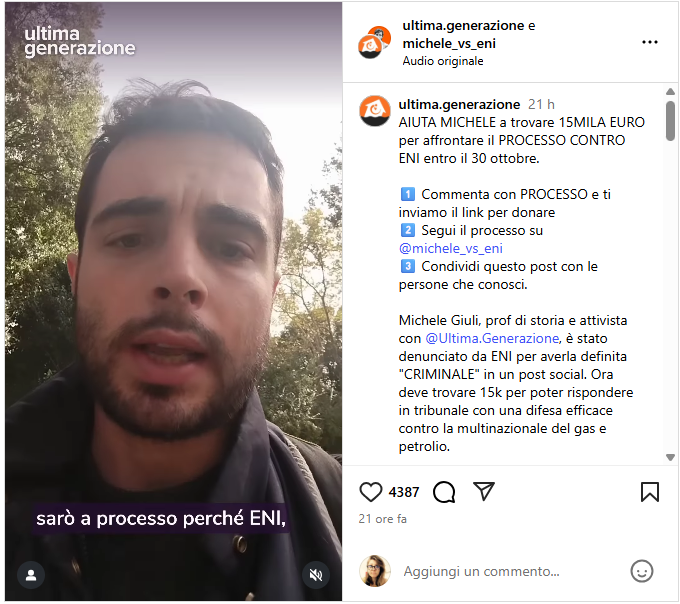 Ma cosa vuol dire fare argine, o almeno provarci, alle querele temerarie? Proviamo a spiegarlo con un fatto. Quello di “Michele vs. Eni”. O di Eni vs. Michele. È tutto detto e scritto con chiarezza nel reel pubblicato da Michele su Instagram, da un account creato con questo nome proprio allo scopo (ottima strategia di comunicazione). Riporto qui per sommi capi, insieme a qualche considerazione.