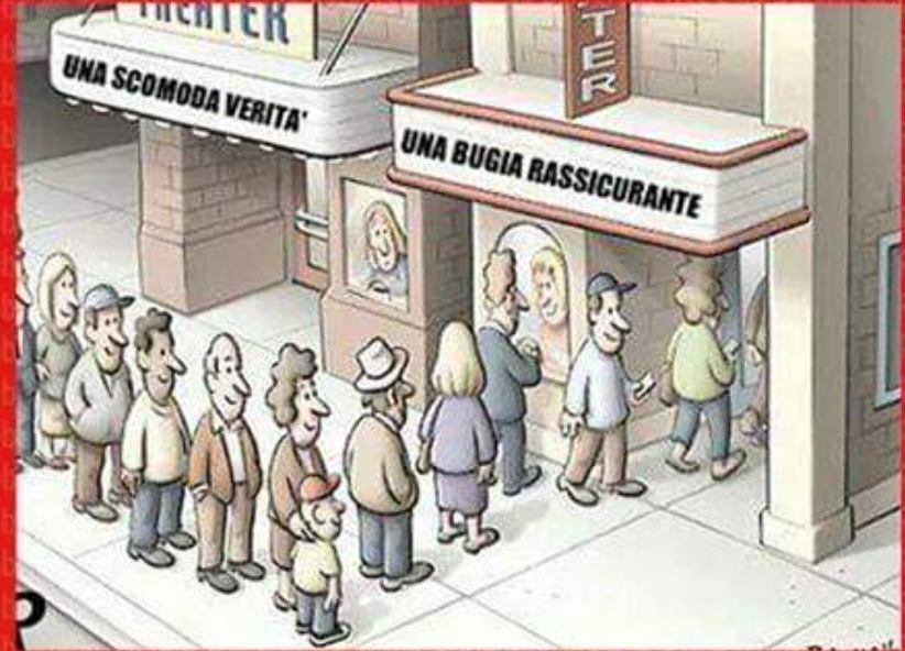 Vi ricordate di quella vignetta ispirata al film di Al Gore, “Una Scomoda Verità?”. Faceva vedere un gran numero di persone che si affollavano intorno a un chiosco che vendeva “Bugie Rassicuranti” mentre nessuno comprava dal chiosco vicino che aveva scritto “Verità Scomode” sull’insegna.