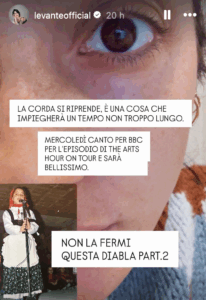 È rimasta intossicata dal fumo di scena durante uno spettacolo a teatro. Il racconto lo fa la stessa Levante sui suoi social: “Due giorni fa ho scoperto di avere una ‘cordite emorragica’ alla corda sinistra. Questa emorragia è stata è stata causata da una forte tosse dopo avere respirato per più di un’ora (all’interno di un teatro) fumo di scena. Una intossicazione come mai nella mia vita. Dopo tre settimane dall’episodio, l’esito è stato scoraggiante, specie in un momento preziosissimo per me come questo. Il risultato è un lungo elenco di medicine e riposo”. E poi la ‘zampata’ ironica: “Secondo voi io e il riposo siamo amici? E soprattutto io e il tipo della macchina del fumo siamo amici? Strunz. Non la fermi questa diabla”. E ancora, per rassicurare tutti, la cantautrice ha aggiunto: “La corda si riprende, è una cosa che impiegherà un tempo non troppo lungo. Mercoledì canto per BBC e sarà bellissimo. Grazie per i vostri messaggi, oggi sono più incazzata di ieri ma ci rido sopra. Sto riposando e non salto gli impegni presi”.