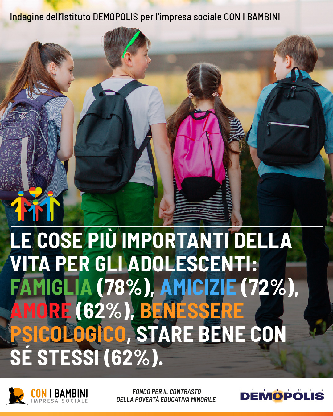 Il direttore di Demopolis Pietro Vento – presente alla conferenza stampa nazionale online – mette in ordine i grafici: “Il futuro è la prima ragione di preoccupazione per il 55% degli adolescenti, ma al secondo posto citano oggi la salute fisica o mentale (37%), un tema che dall’emergenza Covid resta centrale. Le altre principali ragioni di preoccupazione dei ragazzi fanno parte più della sfera personale, fanno eccezione solo le guerre nel mondo, al sesto posto, con il 32% di citazioni. Solo il 35% dichiara di vedere, oggi in Italia, il proprio futuro con ottimismo. Ma il 33% si definisce pessimista, con un dato che sale di 10 punti fra i ragazzi delle periferie e dei quartieri “difficili”, e raggiunge il 73% fra i genitori italiani, che dimostrano di non saper offrire alle nuove generazioni puntelli ed esempi di fiducia cui ispirarsi”. Un Paese con sempre meno giovani e più anziani. Un’Italia dove non stanno bene quelli che vivono nei cosiddetti quartieri poveri ma dove ora hanno problemi anche i figli del dottore: “Secondo gli adolescenti intervistati- continua Vento – le città italiane non sono a misura di minori: meno della metà del campione analizzato ritiene che siano adeguati spazi verdi, scuole, strutture per lo sport, trasporti pubblici. Meno del 30% valuta sufficienti la sicurezza urbana, la qualità dell’aria, i servizi sociali. E, fra i ragazzi che dichiarano di vivere in periferie e quartieri difficili, le valutazioni scendono di oltre 10 punti per tutte le variabili analizzate: oltre i 2/3 ritengono inadeguati servizi sociali e sanitari, occasioni per il tempo libero, sicurezza urbana”. Cambiano, in parte, anche i sogni dei nostri ragazzi. La graduatoria delle “cose importanti della vita” stilata vede ai primi posti la famiglia (78%) e l’amicizia (72%), come dimensioni centrali dell’esistenza ma sul podio fanno salire anche il “benessere psicologico”, lo stare bene con se stessi, a pari merito con l’amore (62%). Mentre un quarto dei giovani intervistati dichiara di non essere “mai” stato – nell’ultimo anno – ottimista verso il futuro, né fiducioso verso gli altri, con un dato che cresce di dieci punti fra i residenti nei quartieri più difficili.