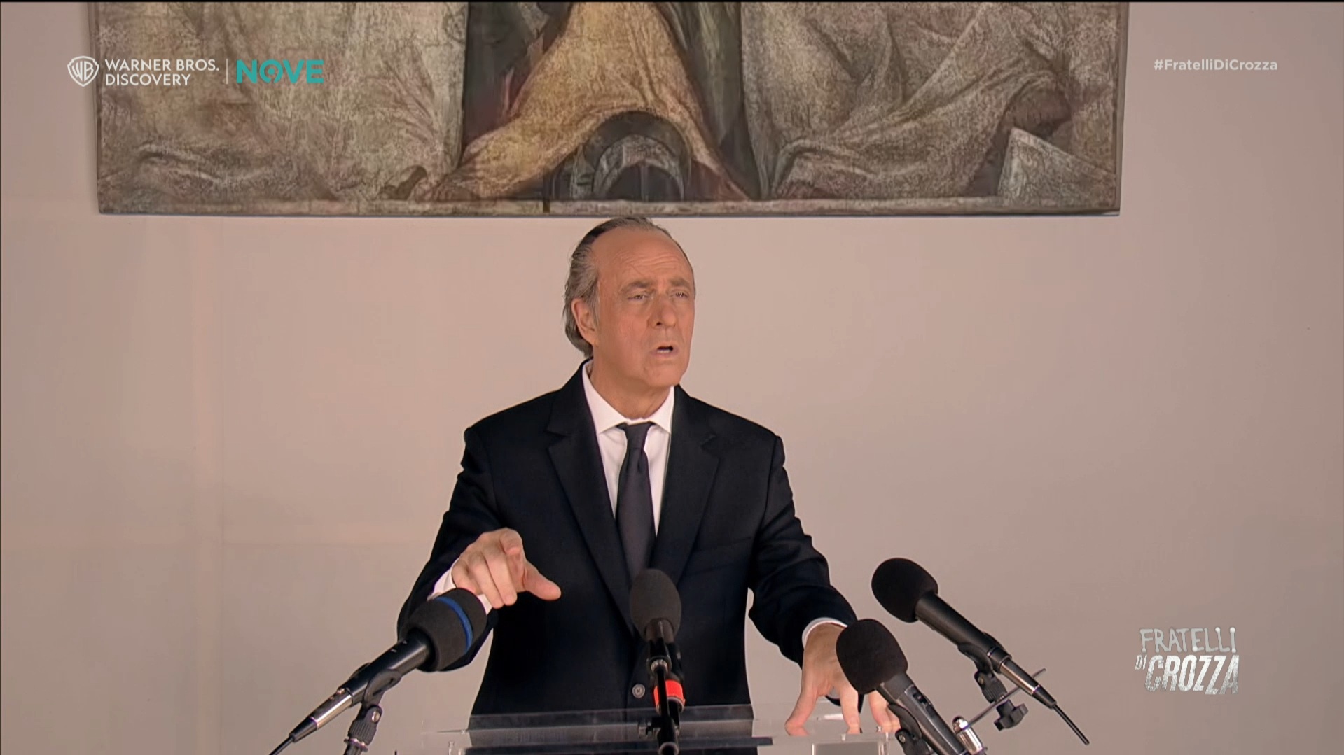 Nella nuova puntata di Fratelli di Crozza, in onda il venerdì sera in prima serata sul Nove e in streaming su Discovery+, Maurizio Crozza veste i panni di Luca Zaia che, tra storie e digressioni improbabili su ladri e “stalli maremmani”, parla di autonomia regionale, della legittima difesa e della sua esperienza al Festival del Cinema di Venezia con il Leone d’Oro.