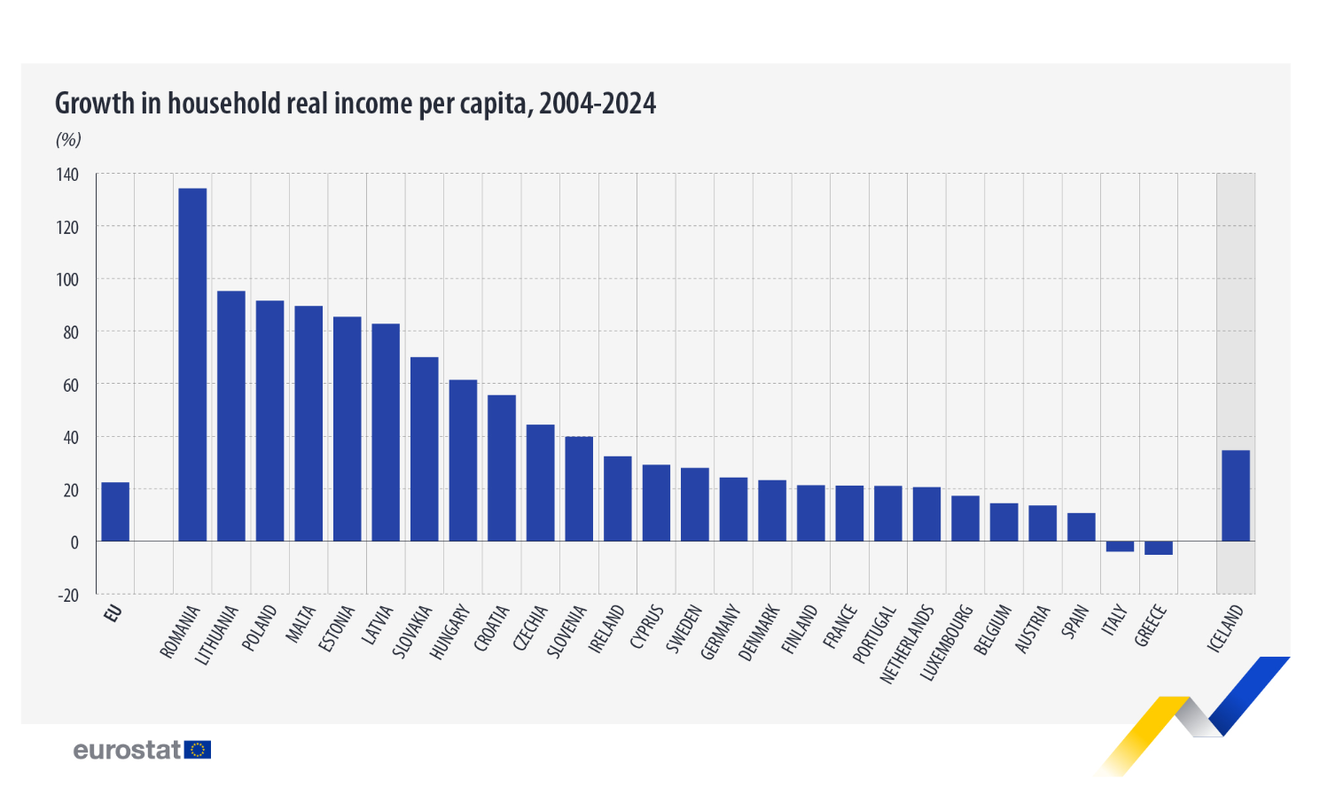Guardando i dati sui singoli Stati Ue il gap è evidente. A godere delle performance migliori sono stati i Paesi che hanno agganciato la convergenza con l’Europa occidentale grazie agli investimenti esteri e a una dinamica produttiva vivace: Romania (+134%), Lituania (+95%), Polonia (+91%) e Malta (+90%). Ma anche le grandi economie avanzate, pur con ritmi diversi, registrano un progresso: +11% per la Spagna, +14% per l’Austria, +15% per il Belgio e +17% per il Lussemburgo. In Francia il reddito è salito di oltre il 21%, in Germania addirittura del 24%.