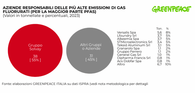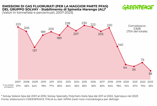 Proprio ad Alessandria, nella frazione di Spinetta Marengo “ha sede l’unica industria chimica italiana – la ex Solvay, oggi Syensqo – che produce ancora Pfas” spiega Greenpeace. Di recente, tra l’altro, il Tar del Piemonte ha dato ragione al Circolo Legambiente Ovadese Valli Stura e Orba, che ha ottenuto che la provincia e la società Syensqo Specialty Polymers Italy la documentazione sulle emissioni finora negata con giustificazioni di segreto industriale. In Italia, si ricorda, non esiste ancora una legge che vieti la produzione e l’utilizzo di Pfas, anche se di recente sono stati fatti diversi passi avanti per quanto riguarda i limiti per le acque potabili, ma rispetto ai gas fluorurati non esiste nessuna norma nazionale che stabilisca un tetto alle emissioni. Le uniche regole sul tema sono contenute nel Regolamento europeo F-Gas del 2014, aggiornato nel 2024, che stabilisce la progressiva riduzione dell’utilizzo di gran parte di queste sostanze entro il 2030. Secondo il regolamento, però, spetta agli Stati membri l’organizzazione dei controlli e la definizione di sanzioni penali ed amministrativo. “Come si evince chiaramente dalla classifica degli stabilimenti per valore di emissione, quello di Spinetta Marengo è responsabile delle più importanti emissioni di F-gas a livello nazionale” racconta Greenpeace. Nel 2023 ha generato il 55% dell’inquinamento italiano legato ai F-gas. “Il residuo 45% di queste emissioni – spiega l’one – è ripartito tra diversi gruppi e realtà industriali, tra cui in prima linea Versalis, il braccio ‘chimico’ di Eni. In alto, nella classifica troviamo anche Lfoundry, Alkeemia e STMicroelectronics”. Stando alle elaborazioni realizzate da Greenpeace Italia, il primato dell’ex Solvay rispetto a tutte le altre aziende che emettono F-gas dura da molto tempo: “Questo gruppo industriale ha emesso da solo, nell’arco di sedici anni, più della metà dell’inquinamento italiano relativo a questi composti”.