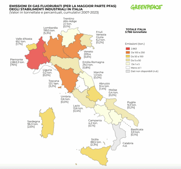 L’incidenza delle industrie che si trovano nelle altre regioni (anche Veneto, Lombardia e Toscana) sul valore complessivo delle emissioni è minima rispetto ai valori piemontesi (ma tutt’altro che trascurabile in termini assoluti), spiega Greenpeace. Il database del Registro europeo Prtr copre tutto il territorio nazionale, anche la Calabria. Se un gestore, però, emette una sostanza monitorata dal Prtr in quantità inferiore alla soglia di dichiarazione, non è tenuto a comunicare il dato al registro nazionale. Le differenze tra i dati regionali possono quindi essere riconducibili anche al tipo di industria presente sul territorio, al regime produttivo, alla gestione delle perdite e dei rabbocchi di gas fluorurati nei sistemi di refrigerazione. Ma, come spiega da tempo l’Agenzia Europea dell’ Ambiente (European Environment Agency), inoltre, la diffusione aerea di queste sostanze, determina anche “un conseguente deposito di Pfas su suolo e corpi idrici”.