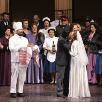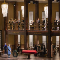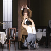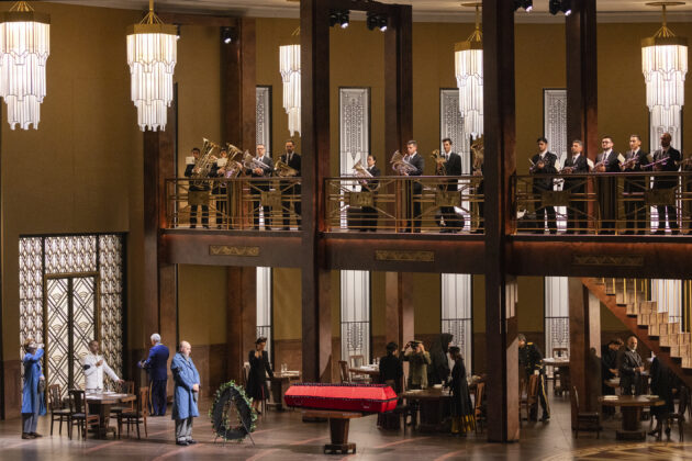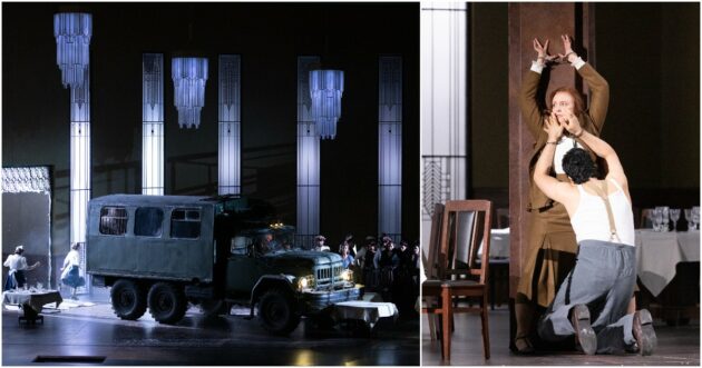 Barkhatov ambienta la sua Lady Macbeth negli anni Cinquanta, ironicamente (o forse no) nel periodo che porterà alla morte di Stalin, il censore di Shostakovich. La scenografia ha uno sviluppo orizzontale, diviso a metà. In una scena ci sono sopra le cucine (sono molto i personaggi secondari anche tra la servitù della famiglia di Katerina che compaiono via via), sotto la camera da letto della protagonista e del marito Zinovij e l’ufficio di quest’ultimo. In una seconda scena sotto si trova un grande salone da pranzo e sopra un balcone. Il regista sfrutta questi molti spazi tutti a vista per spingere l’opera con ritmo cinematografico, per non dire da thriller a puntate: una serie tv, insomma, e ci scuseranno subito gli esperti di lirica per questa metafora ormai un po’ logora. E però è vero che la cura registica per i dettagli fa sì che ogni attore, anche all’opposto del movimento della scena, anche nei momenti solo musicali e senza interventi dei protagonisti, riempie l’occhio e l’attenzione dello spettatore.