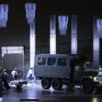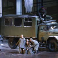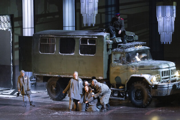 Katerina e Sergej si sposano davanti a numerosi invitati ma nel frattempo – dopo che finora è rimasto nascosto dentro un frigo – viene scoperto il cadavere di Zinovij, il marito ammazzato. Qui arriva una prima trovata scenica di Barkhatov che può assomigliare pure a una citazione. Durante la festa nuziale i morti (suocero e marito della sposina killer) ricompaiono sottoforma di ombre e visioni: come fantasma, diafano, Boris (e ricorda un po’ il Convitato di pietra del Don Giovanni), Zinovji addirittura spuntando dalla torta nuziale (e la scena reale della festa con gli invitati si “congela”). Ad ogni modo la notizia del cadavere arriva alla polizia. “È finita” dice Katerina. “Fuggiamo” dice Sergej. I due vengono arrestati e il cambio di scena – altra idea vincente di Barkhatov – avviene con la dirompente entrata in scena di un camion militare. Letteralmente dirompente: sfonda il portone di quella che sarebbe la casa di Katerina e improvvisamente ci si ritrova nel campo di prigionia.