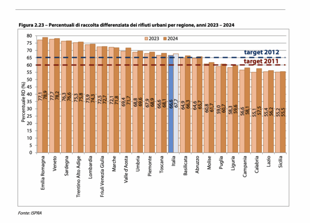 Le percentuali più alte di raccolta si registrano in Emilia-Romagna (78,9%), che registra il maggior aumento, in Veneto (78,2%), Sardegna (76,6%), Trentino-Alto Adige (75,8%), Lombardia (74,3%) e Friuli-Venezia Giulia (72,7%). Superano l’obiettivo del 65% anche Marche (71,8%), Valle d’Aosta (71,7%), Umbria (69,6%), Piemonte (68,9%), Toscana (68,1%), Basilicata (66,3%) e Abruzzo (65,7%). Nel complesso, più del 72% dei comuni ha conseguito una percentuale di raccolta differenziata superiore al 65%. Nell’ultimo anno, l’89,7% dei comuni intercetta oltre la metà dei propri rifiuti urbani in modo differenziato. Tra le città con oltre 200.000 abitanti, i livelli più alti di raccolta differenziata sono a Bologna (72,8%), Padova (65,1%), Venezia (63,7%) e Milano (63,3%). Seguono Firenze (60,7%), Messina (58,6%), Torino e Verona (57,4%). Più indietro, seppure in crescita, Genova (49,8%), Roma (48%), Bari (46%) e Napoli (44,4%).