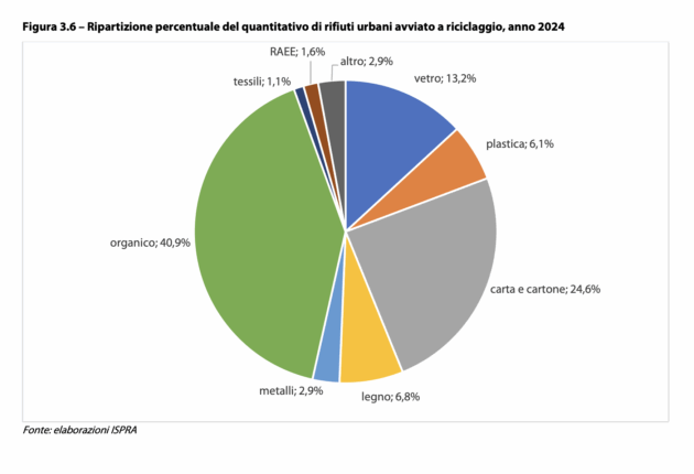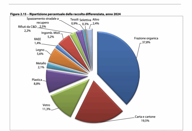 Tra i rifiuti differenziati, l’organico si conferma la frazione più raccolta in Italia (37,8% del totale), seguita dalla carta e cartone, con il 19,5%, dal vetro (11,3%) e plastica (8,8%). Il 96% dei rifiuti plastici raccolti in modo differenziato è costituito da imballaggi.