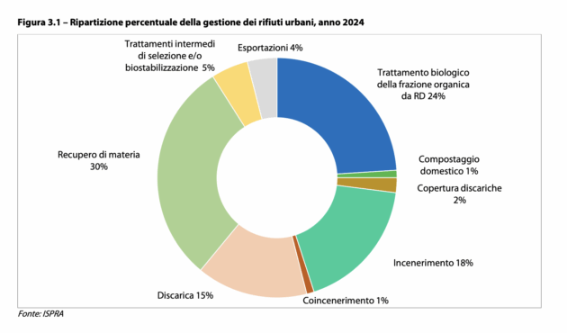 Agli impianti di recupero di materia per il trattamento delle raccolte differenziate viene inviato il 54% dei rifiuti prodotti, il 18% viene incenerito, mentre l’1% viene inviato ad impianti produttivi come cementifici e centrali termoelettriche per produrre energia. Un altro 2% viene utilizzato per la ricopertura delle discariche, il 5% dei rifiuti (che arriva da impianti di trattamento meccanico o meccanico-biologico), viene destinato alla raffinazione per la produzione di combustibile solido secondario (Css) o biostabilizzazione, il 4% è esportato (circa 1,3 milioni di tonnellate) e l’1% viene gestito direttamente dai cittadini attraverso il compostaggio domestico (316mila tonnellate). I rifiuti urbani smaltiti in discarica rappresentano il 14,8% dei rifiuti prodotti (in termini quantitativi, oltre 4,4 milioni di tonnellate, in calo del 3,7% rispetto al 2023).
