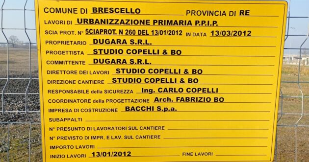 Dice un cartello ormai logoro e sbiadito, davanti alla recinzione dell’immensa area di Brescello destinata, nell’ambizione dei proprietari, ad un grande polo provinciale della logistica intermodale: “Costruire il domani”. Ma il domani è un incubo per i cittadini della zona che si sono svegliati con la notizia del sequestro e delle perquisizioni disposti dalla Procura di Reggio Emilia. Nella spianata che si affaccia su via Peppone e Don Camillo (oltre 250mila metri quadri di suolo) già sono visibili lo scheletro in cemento e la copertura dei grandi capannoni che i proprietari della Dugara SpA, Franca Soncini e il figlio Claudio Bacchi, sognano di rendere operativi almeno dal gennaio 2012, quando iniziarono i lavori di urbanizzazione, mai conclusi correttamente, secondo la procura.