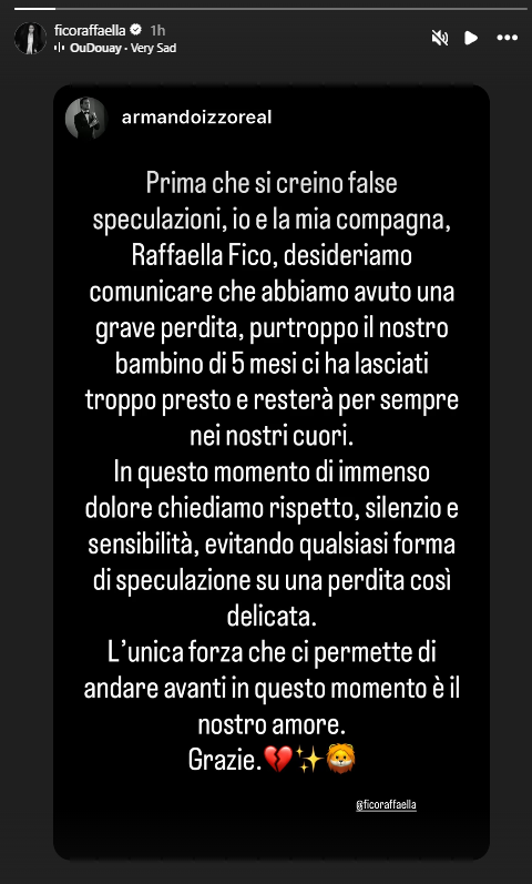 A rendere pubblica la notizia è stato anche il compagno, il calciatore Armando Izzo, che ha diffuso un messaggio sui social per chiarire la situazione ed evitare speculazioni. “Prima che si creino false ricostruzioni, io e la mia compagna, Raffaella Fico, desideriamo comunicare che abbiamo avuto una grave perdita: purtroppo il nostro bambino di cinque mesi ci ha lasciati troppo presto e resterà per sempre nei nostri cuori”, ha scritto. Nel comunicato non vengono fornite informazioni sulle cause dell’accaduto. Izzo ha inoltre chiesto rispetto e riservatezza in un momento definito “di immenso dolore”, invitando a evitare commenti o ipotesi sulla vicenda. “L’unica forza che ci permette di andare avanti in questo momento è il nostro amore”, ha aggiunto, ringraziando chi ha espresso vicinanza. La coppia ha scelto di affrontare il lutto lontano dai riflettori, ribadendo la volontà di mantenere il massimo riserbo su una vicenda personale e delicata.