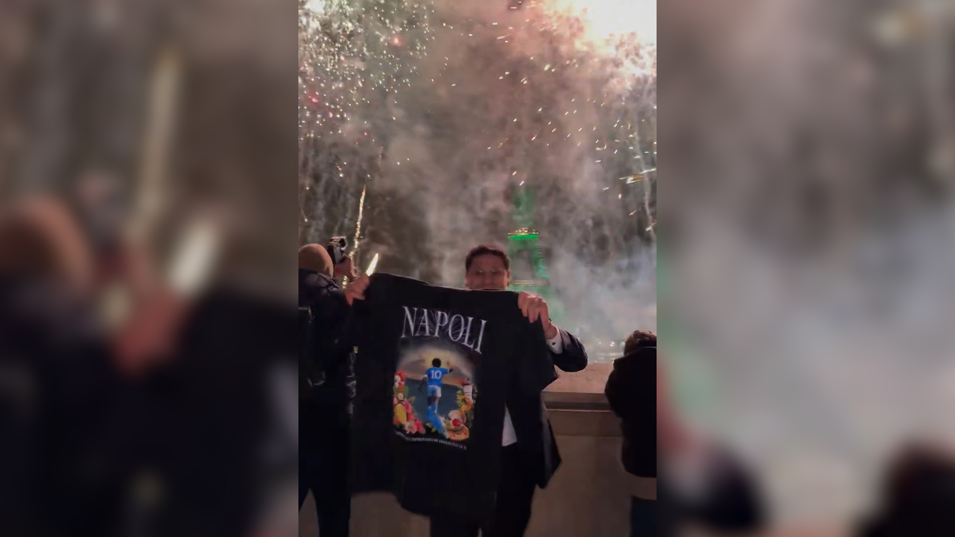 Nella clip lo youtuber è di spalle davanti alla spianata del Trocadero, la Torre Eiffel sullo sfondo, indossa un abito nero ed ha appoggiata sulle spalle una maglietta del Napoli.