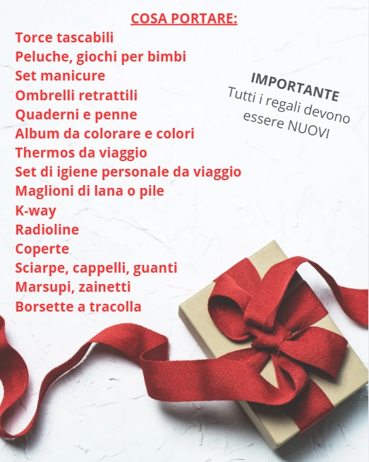 Questo l’elenco degli oggetti che si possono donare: giochi per bambine e bambini di tutte le età (preferibilmente non in scatola), gift card per adolescenti, articoli sportivi come palloni da calcio o da pallavolo, indumenti e accessori femminili e maschili, biancheria e casalinghi, plaid per le persone anziane. Chi volesse partecipare a Milano, può consegnare i pacchi sabato 20 dicembre in via Olivetani 3, dalle 10 alle 18. Per ulteriori informazioni sull’iniziativa basta visitare questo link.