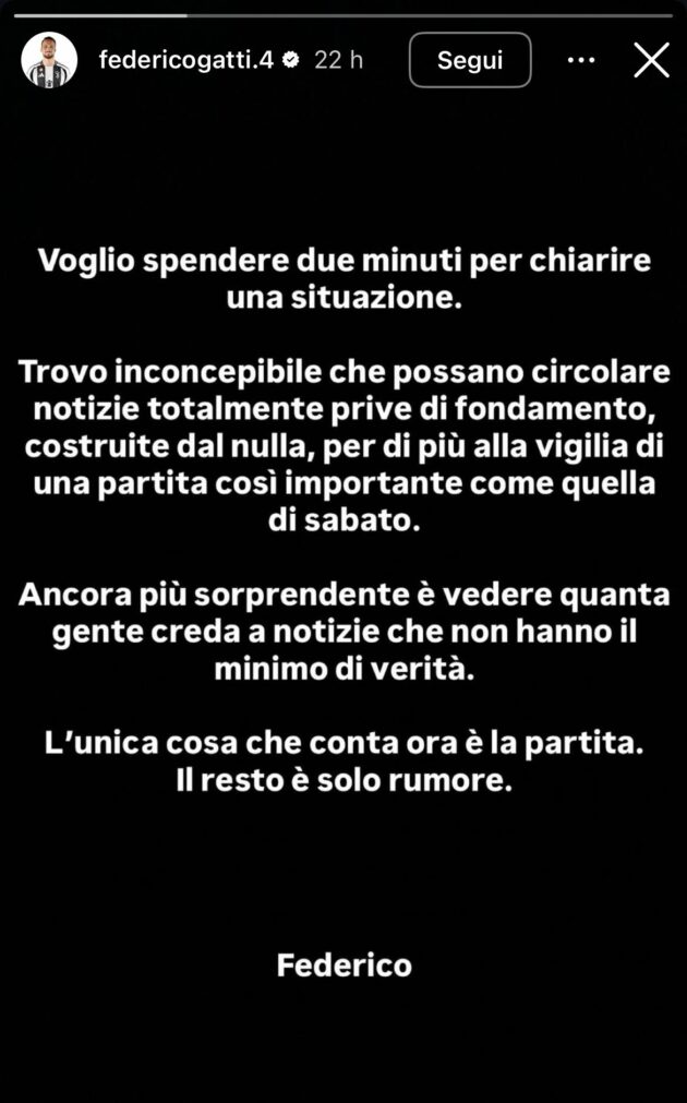 Indiscrezioni smentite dagli stessi calciatori della Juventus. Prima Manuel Locatelli ha condiviso una storia Instagram che lo ritrae con David accompagnata da tre cuori, quasi a voler sottolineare l’affetto nei confronti del compagno. Poi anche Mattia Perin – in una storia Instagram con Khephren Thuram e lo stesso David – ha scritto: “My bros”. Miei fratelli. A prendere posizione sul tema è stato Federico Gatti, che in una Instagram story di solo testo ha scritto: “Voglio spendere due minuti per chiarire una situazione. Trovo inconcepibile che possano circolare notizie totalmente prive di fondamento, costruite dal nulla, per di più alla vigilia di una partita così importante come quella di sabato”, ha esordito il difensore bianconero. Che ha proseguito: “Ancora più sorprendente è vedere quanta gente creda a notizie che non hanno il minimo di verità. L’unica cosa che conta ora è la partita. Il resto è solo rumore”.