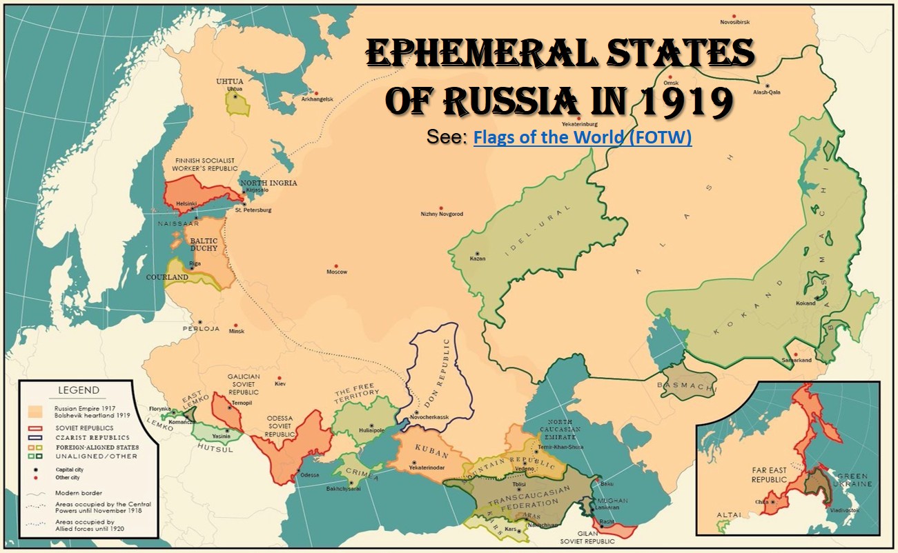 Chi vuole dare esempio di minimalismo, moderazione e realismo, si limita alla frammentazione seguita alla Rivoluzione di ottobre. La guerra civile che devastò il paese dal 1918 al 1920 fu alimentata dalle generose donazioni dell’Occidente democratico e vide il sorgere di vari staterelli (vedi figura sotto). Non mancano mappe immaginarie più complesse e ardite. Sono quelle fantasticate da chi, pur diversamente adolescente, frequenta il gioco del Risiko con assiduità. E mira a conquistare la Jacuzia.