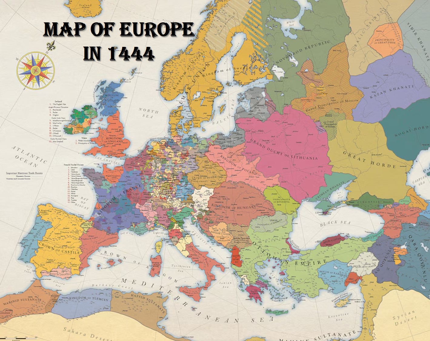 Leggendo un saggio sulla Grande Guerra, scopro come le dinamiche e le debolezze dell’Ue abbiano non poche, inquietanti somiglianze con quelle che fiaccavano l’impero di Francesco Giuseppe alla vigilia dell’attentato di Sarajevo. Se s’imbarca in una guerra contro la Russia, in caso d’insuccesso l’Ue rischia la dissoluzione. Anche l’integrità degli stati dell’Unione potrebbe essere messa in discussione. Gli egoismi, le identità rigide e i linguaggi vuoti non mancano in Europa. La nuova carta dell’Europa post-bellica potrebbe richiamare molto da vicino quella del 1440 (vedi figura sotto), quando la pace di Westfalia (1648) era ancora un miraggio. Sarebbe un esito non troppo sgradito a chi governa le Americhe e l’Estremo Oriente.