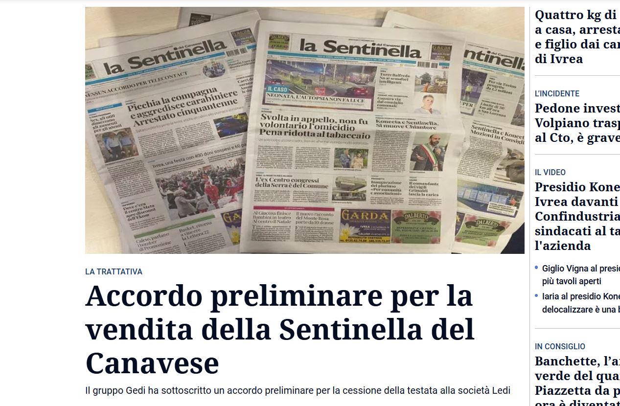 La holding Exor della famiglia Agnelli inizia a vendere quel che resta del gruppo editoriale Gedi dopo la cessione della maggior parte delle testate locali. In attesa di conferme sul destino di Repubblica, Stampa, HuffPost e delle radio, il gruppo ha fatto sapere di aver sottoscritto un accordo preliminare per la cessione della Sentinella del Canavese – storica testata fondata nel 1893 – alla Ledi s.r.l., la società pugliese del gruppo della ristorazione Ladisa che negli anni scorsi aveva ottenuto in gestione temporanea La Gazzetta del Mezzogiorno, salvo poi interrompere le pubblicazioni e perdere il bando per l’aggiudicazione della testata.