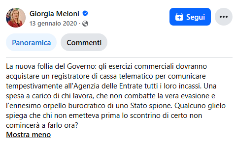 Cinque anni fa, dall'opposizione, la leader di FdI definiva "follia" l'obbligo per gli esercenti di dotarsi della cassa telematica che comunica all'Agenzia delle Entrate gli incassi